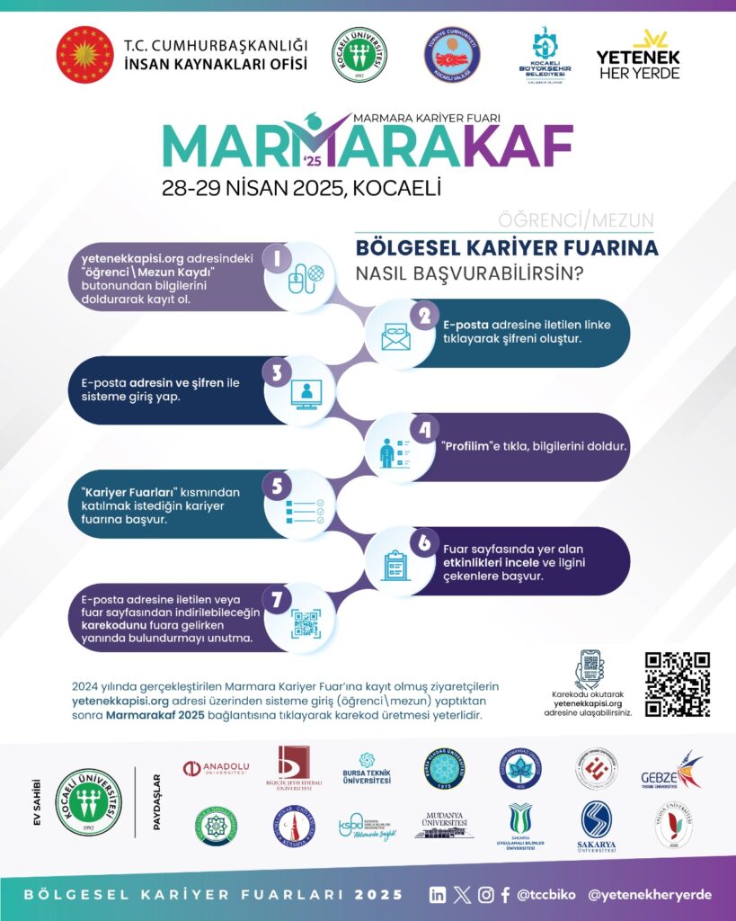 Kariyerine sağlam bir başlangıç yapmak isteyen öğrenciler ve mezunlar için harika bir fırsat! Marmara Kariyer Fuarı (MarmaraKaf 2025), Cumhurbaşkanlığı İnsan Kaynakları Ofisi’nin koordinasyonunda, Kocaeli Üniversitesi’nin ev sahipliğinde 28-29 Nisan 2025 tarihlerinde Kocaeli Büyükşehir Belediyesi Kongre ve Kültür Merkezi’nde gerçekleşiyor.