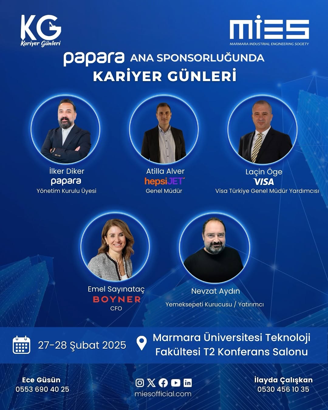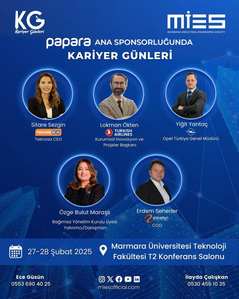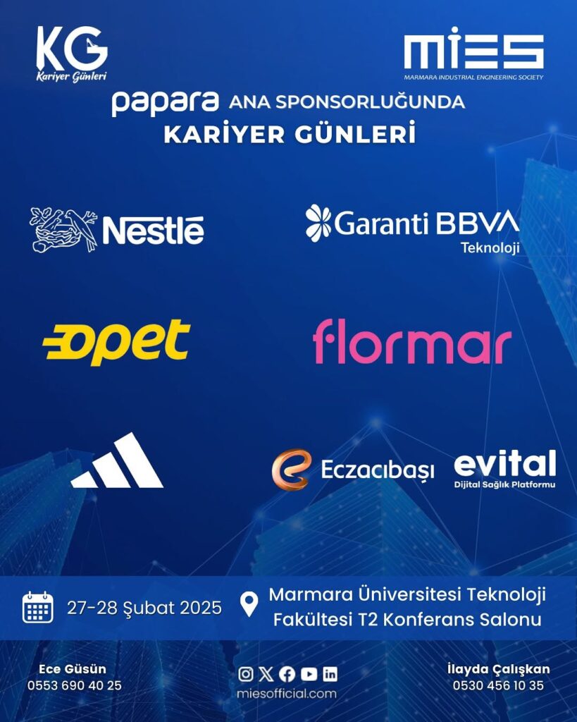 Kariyerine yön vermek, sektör liderleriyle tanışmak ve profesyonel dünyaya adım atmak için büyük bir fırsat! Marmara Üniversitesi Endüstri Mühendisliği Kulübü (MIES) tarafından 16. kez düzenlenen Kariyer Günleri, 27-28 Şubat 2025 tarihlerinde Marmara Üniversitesi Teknoloji Fakültesi T2 Konferans Salonu’nda gerçekleşiyor. 🌟
